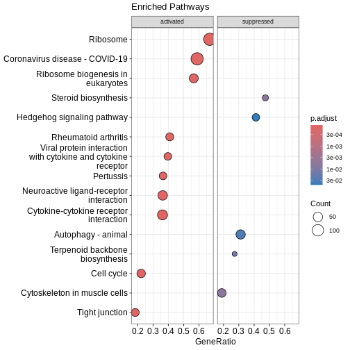 dotplot(kk2, showCategory = 10, title = "Enriched Pathways" , split=".sign") + facet_grid(.~.sign)