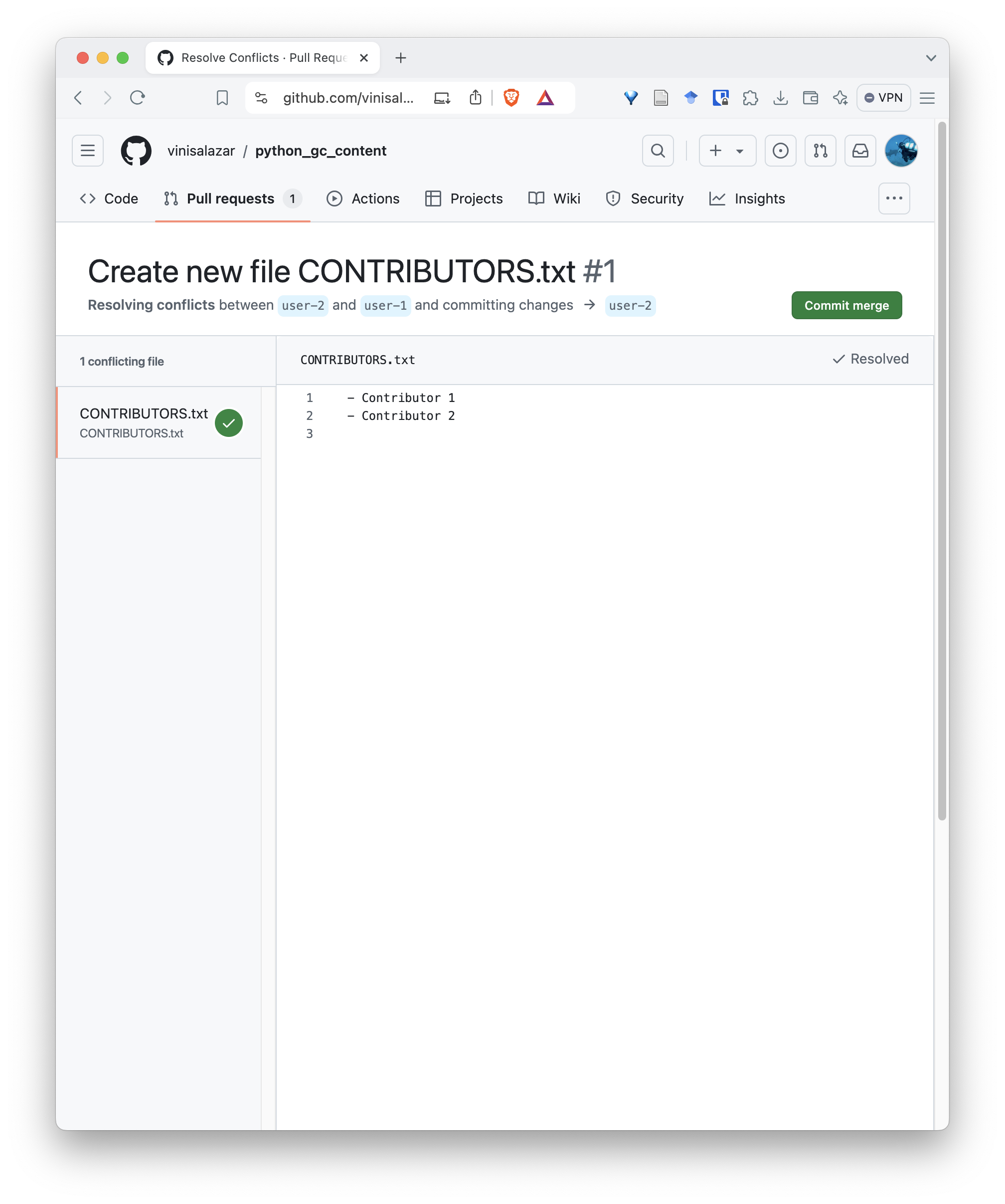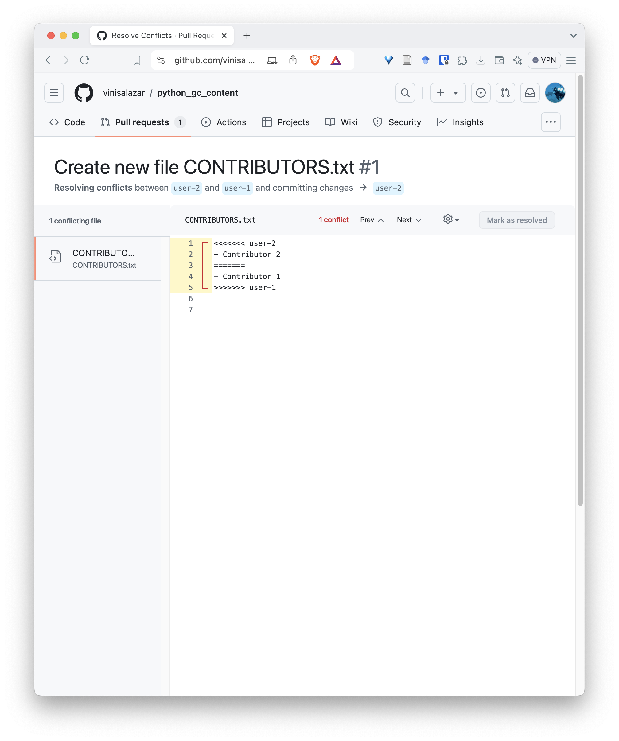 When clicking “Resolve conflicts”, it should bring up a text editor where we can edit the conflicting file: