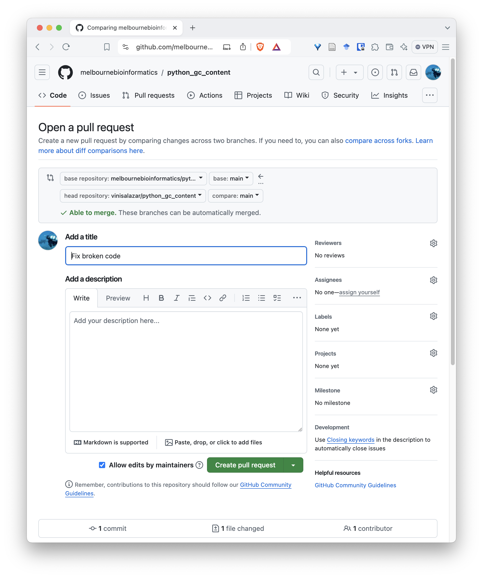 After you click that, you will be taken to a screen to create your pull request. A default title will be given to your PR, but you can edit it if you want, and give it a description. Repositories may have different policies regarding the content of the PR, but for this one we can just keep it simple and create the pull request: