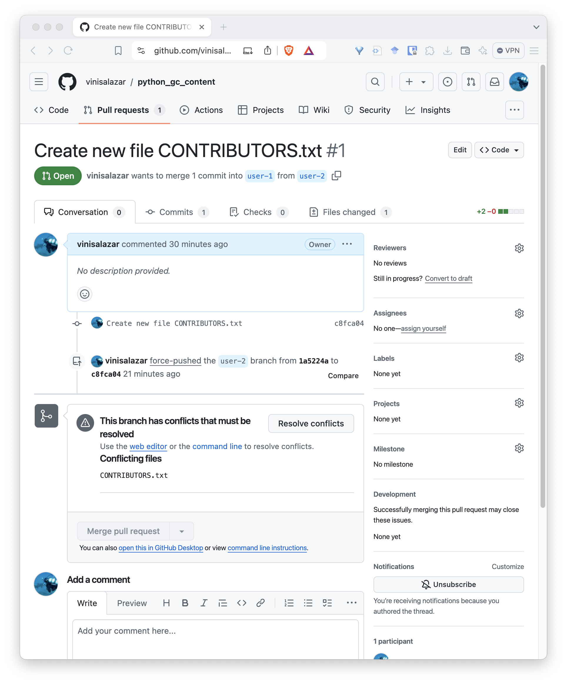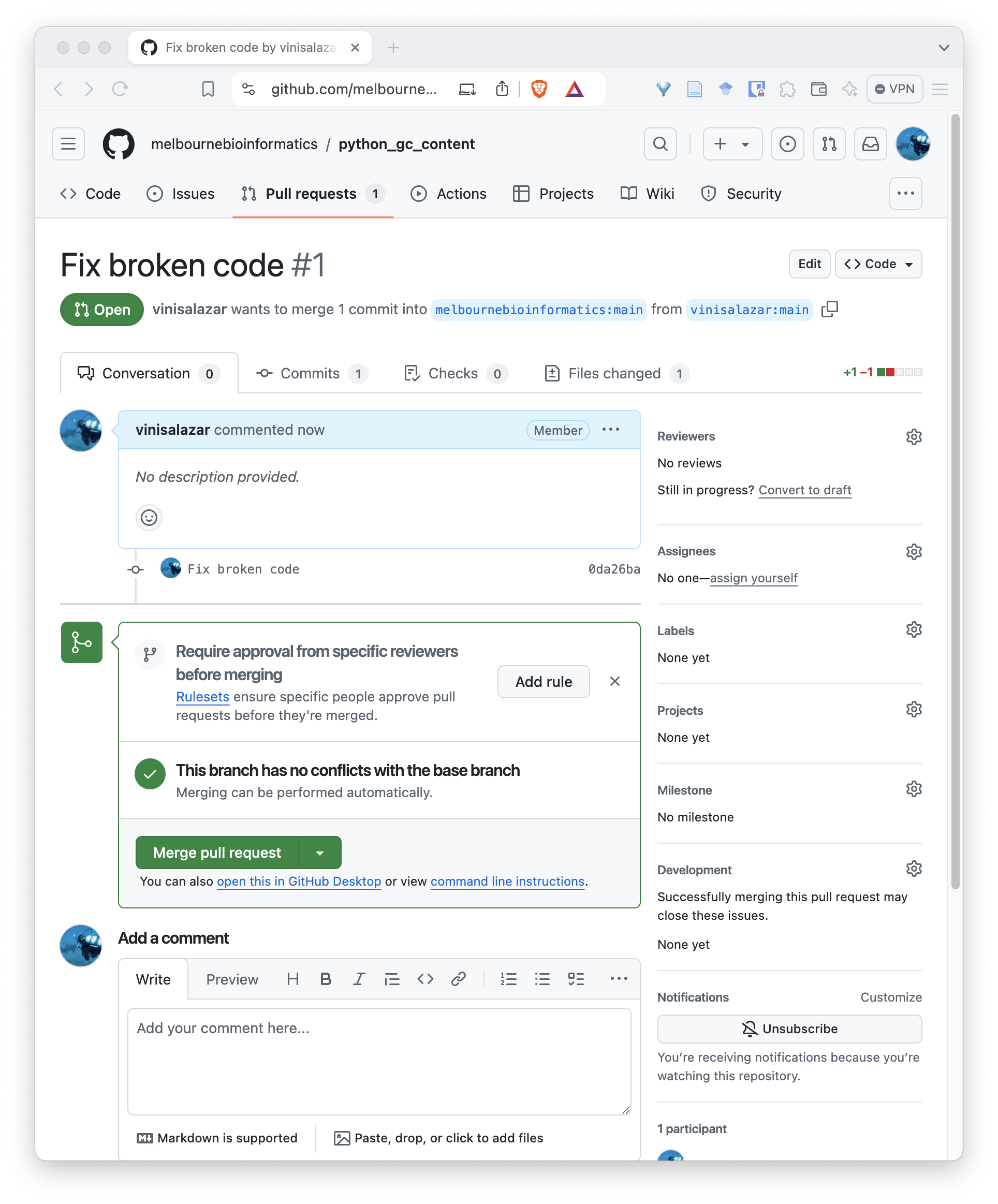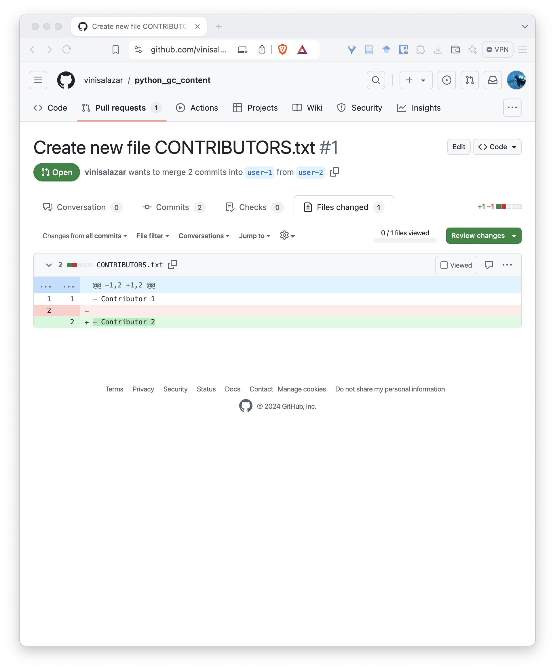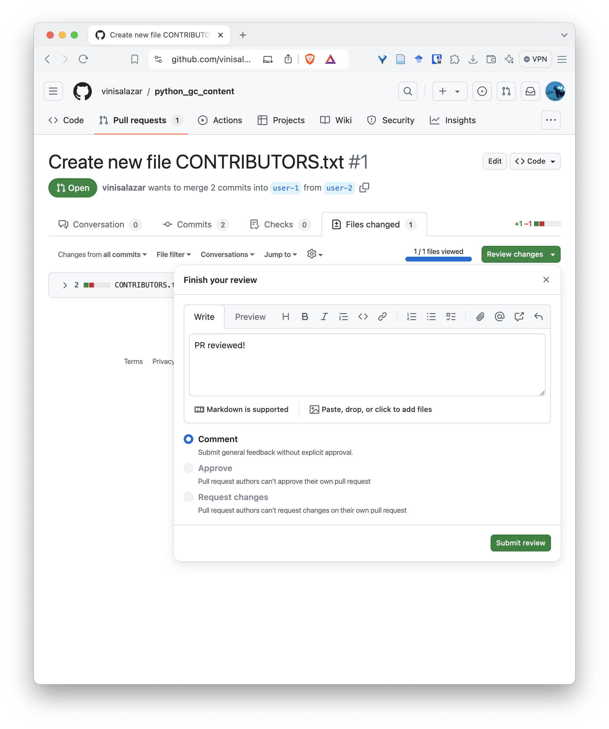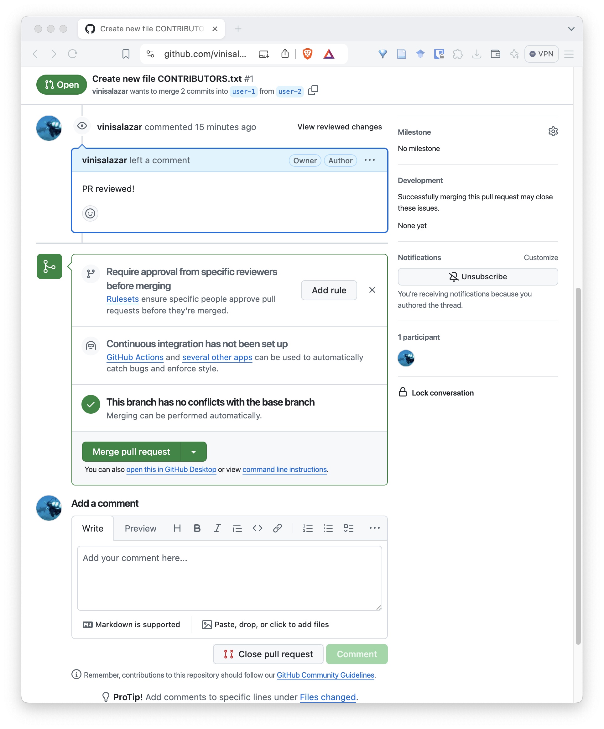 Because of that, let’s practice reviewing a pull request, that is, the scenario where someone would submit a pull request to our repository.