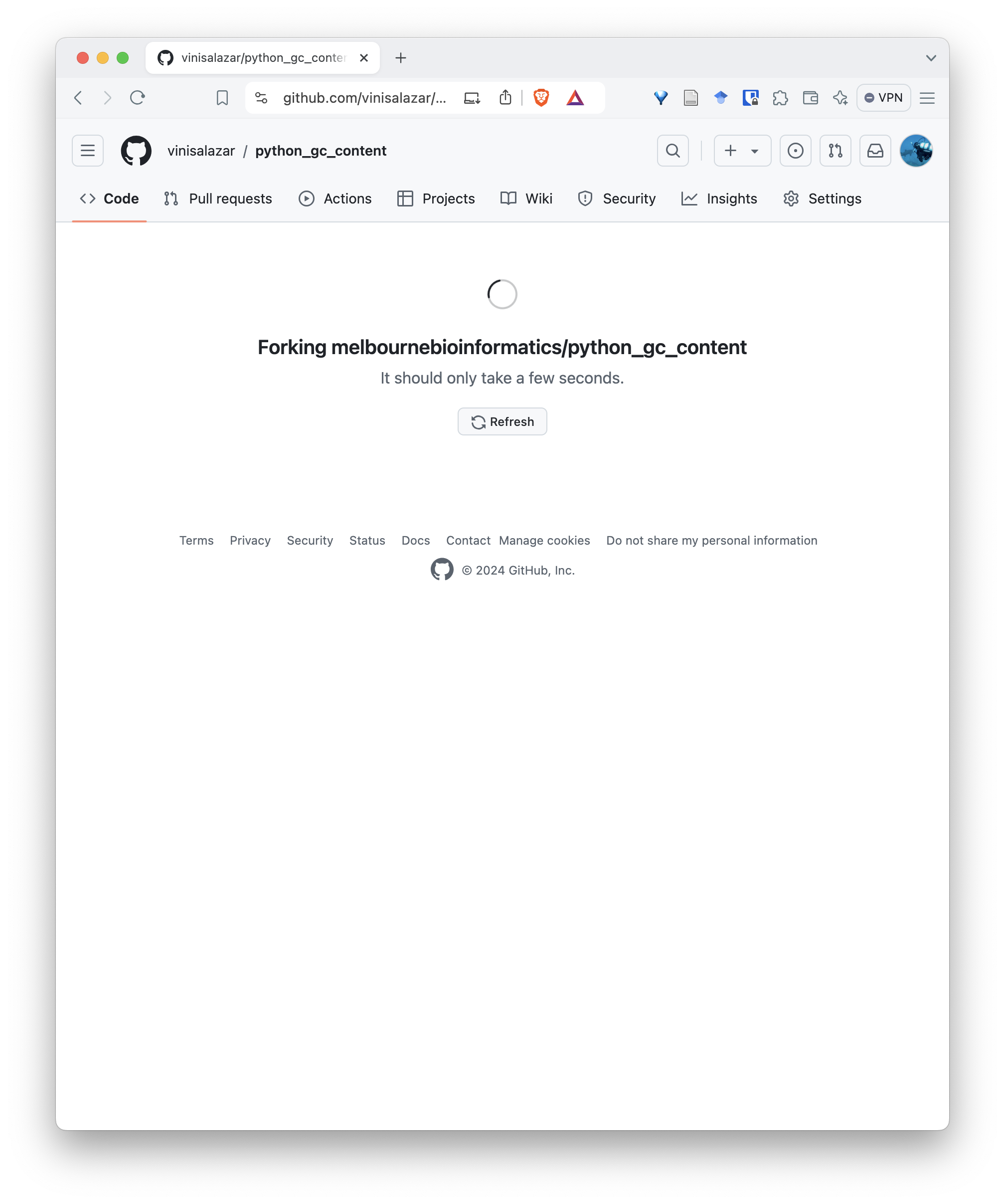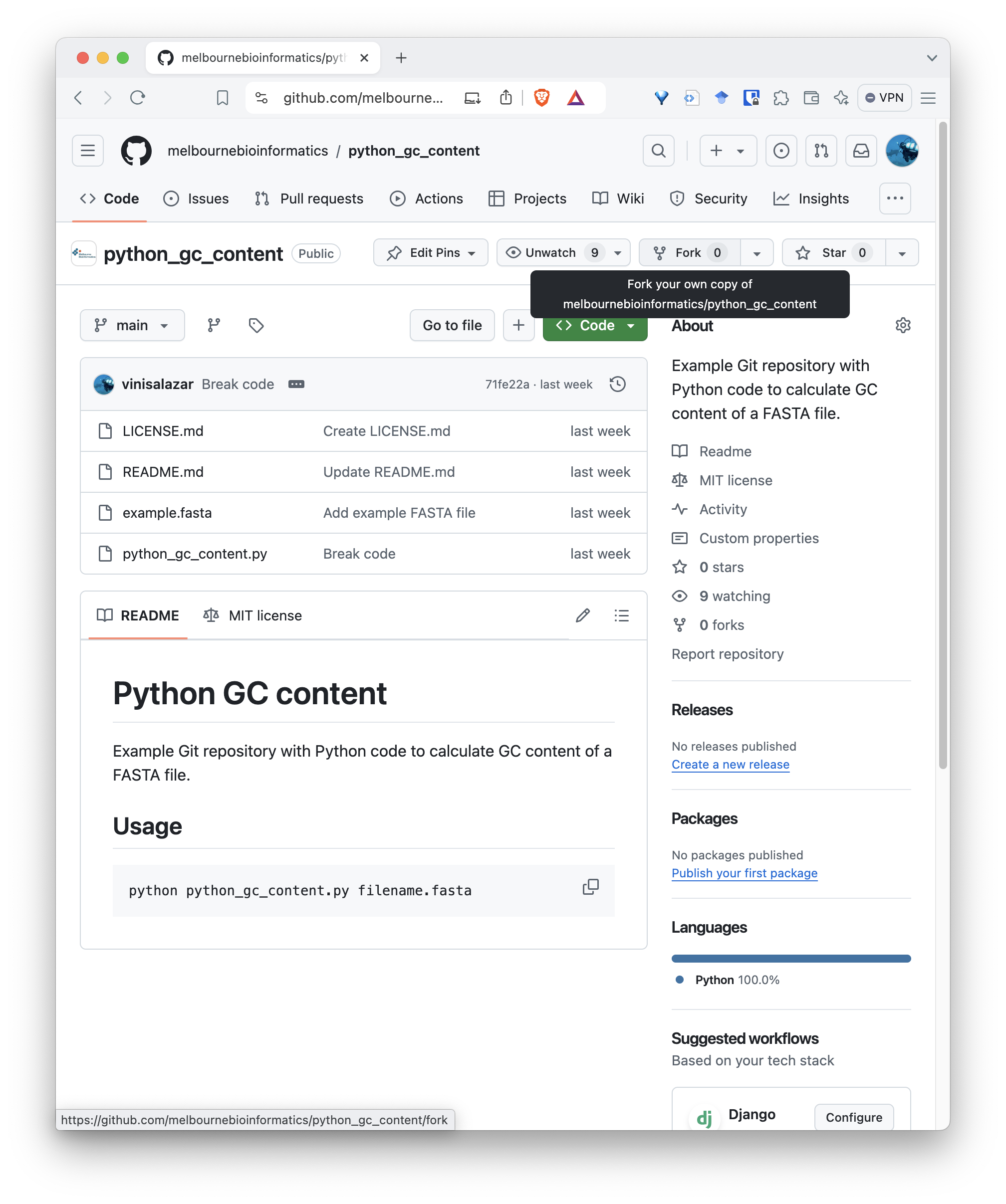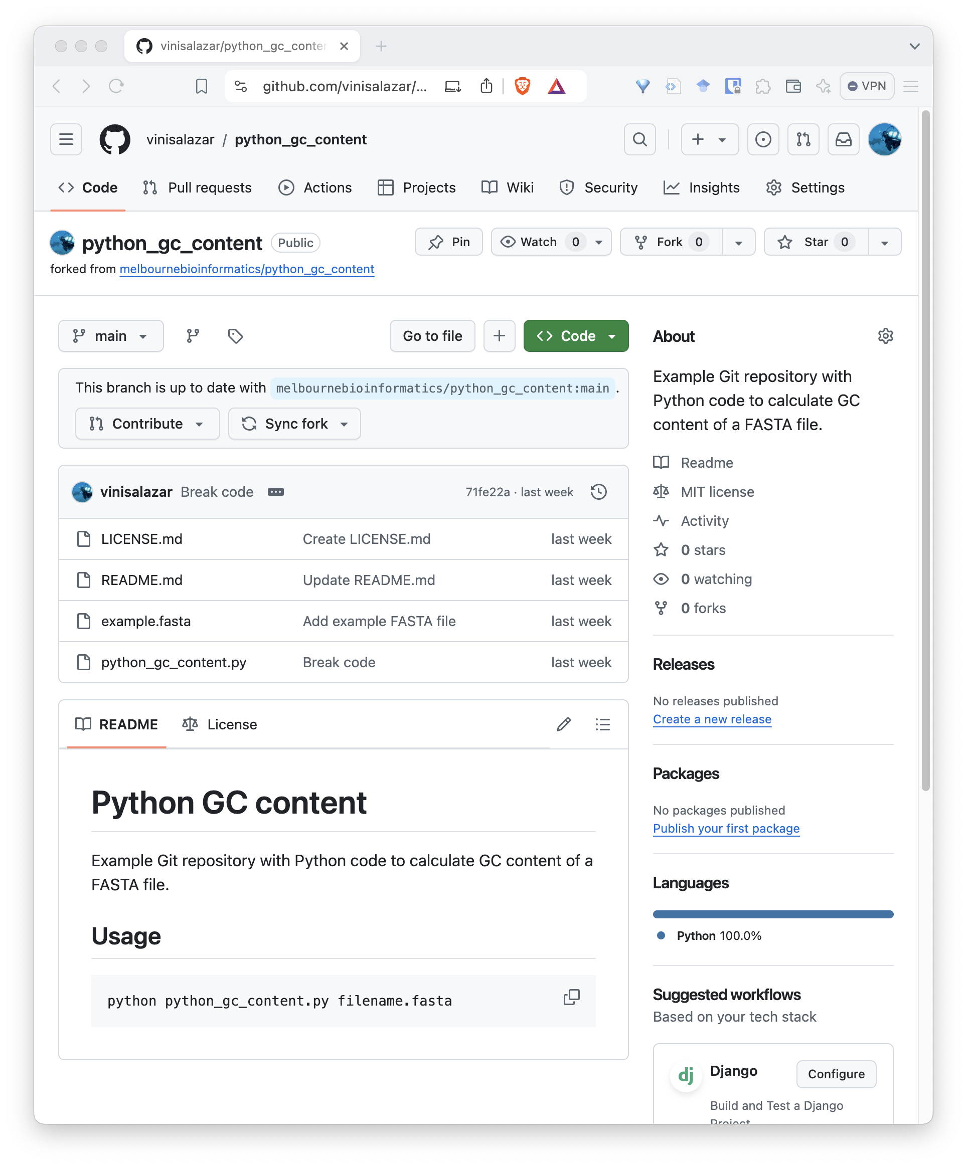 Now you have your own copy of the repository, that you have total control over! Notice that the top-left shows that the repository was forked from the original repository.