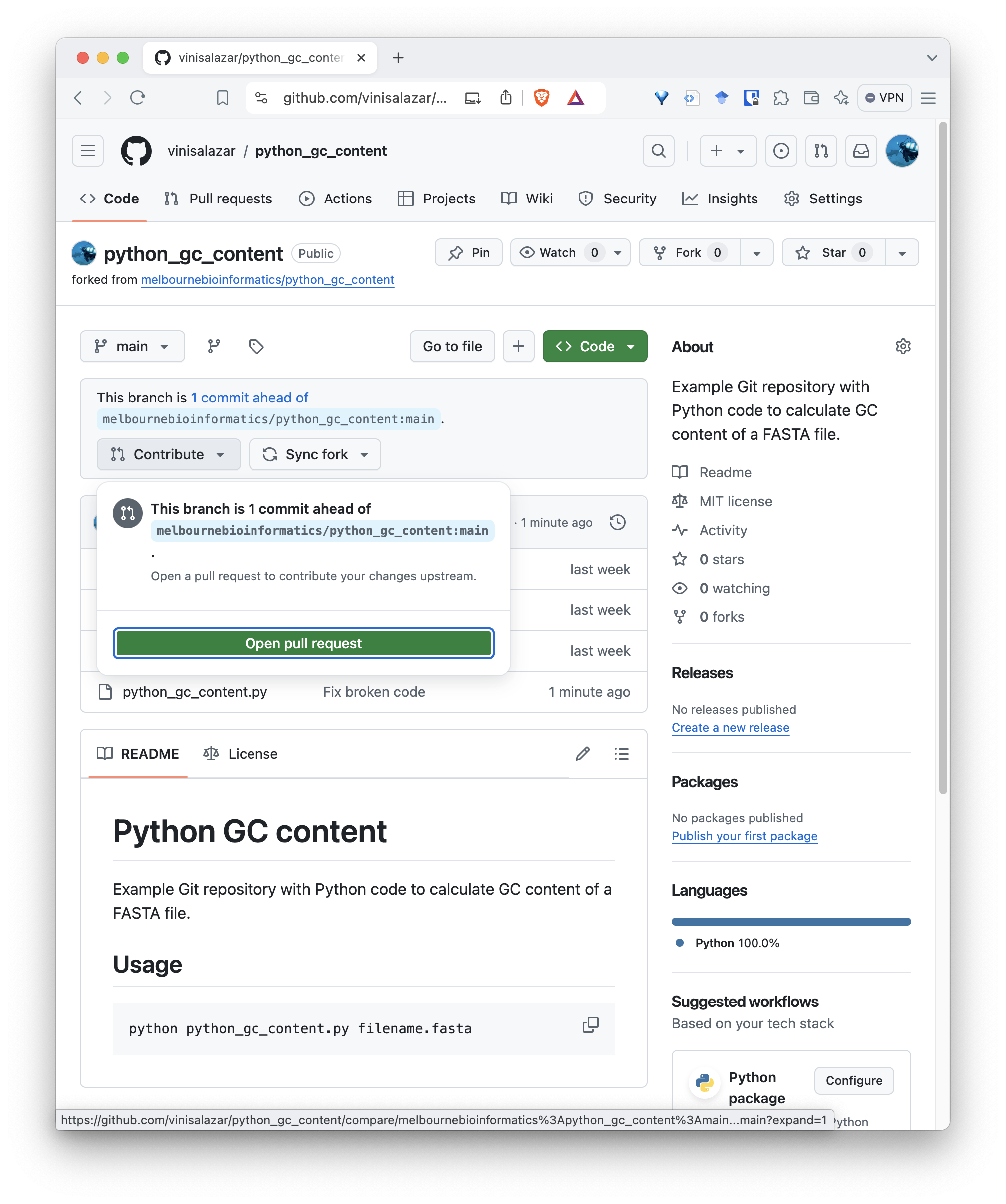 To create a pull request, go to the page of your fork on GitHub after pushing the fixed code. At the top of the code, there will be a bar noting the difference between your fork and the original repository. If you click on “Contribute”, you can create a pull request: