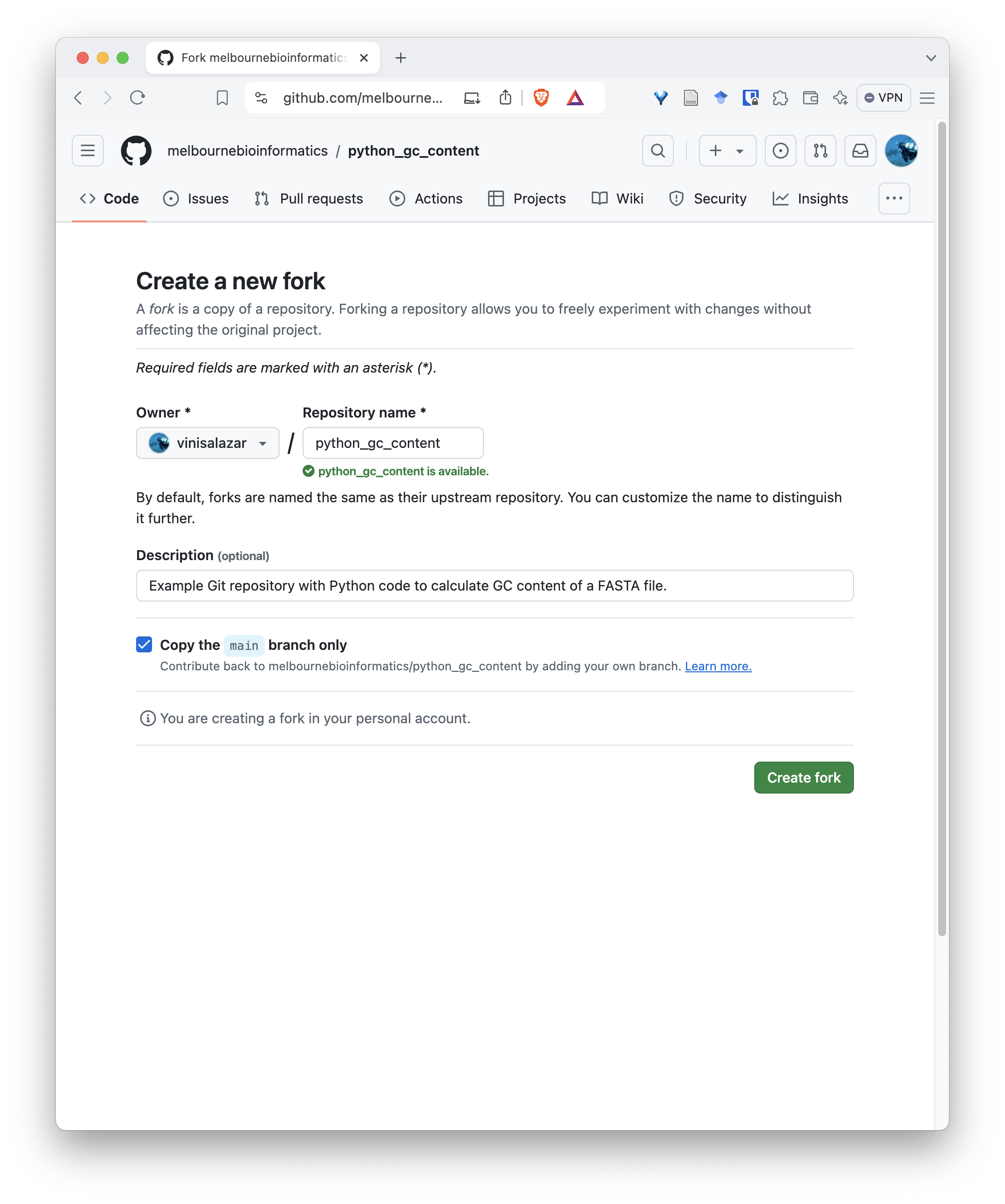 You will be taken to the fork page. There’s no need to change anything here, but make sure you are forking it with your profile as the “Owner”: