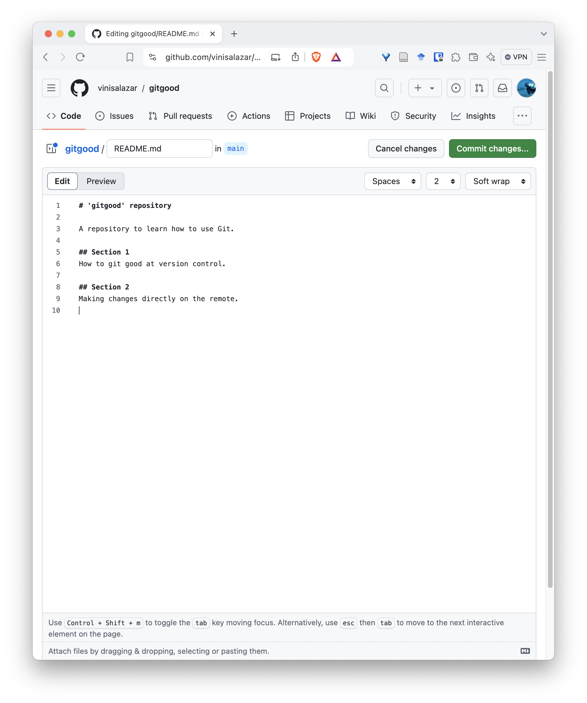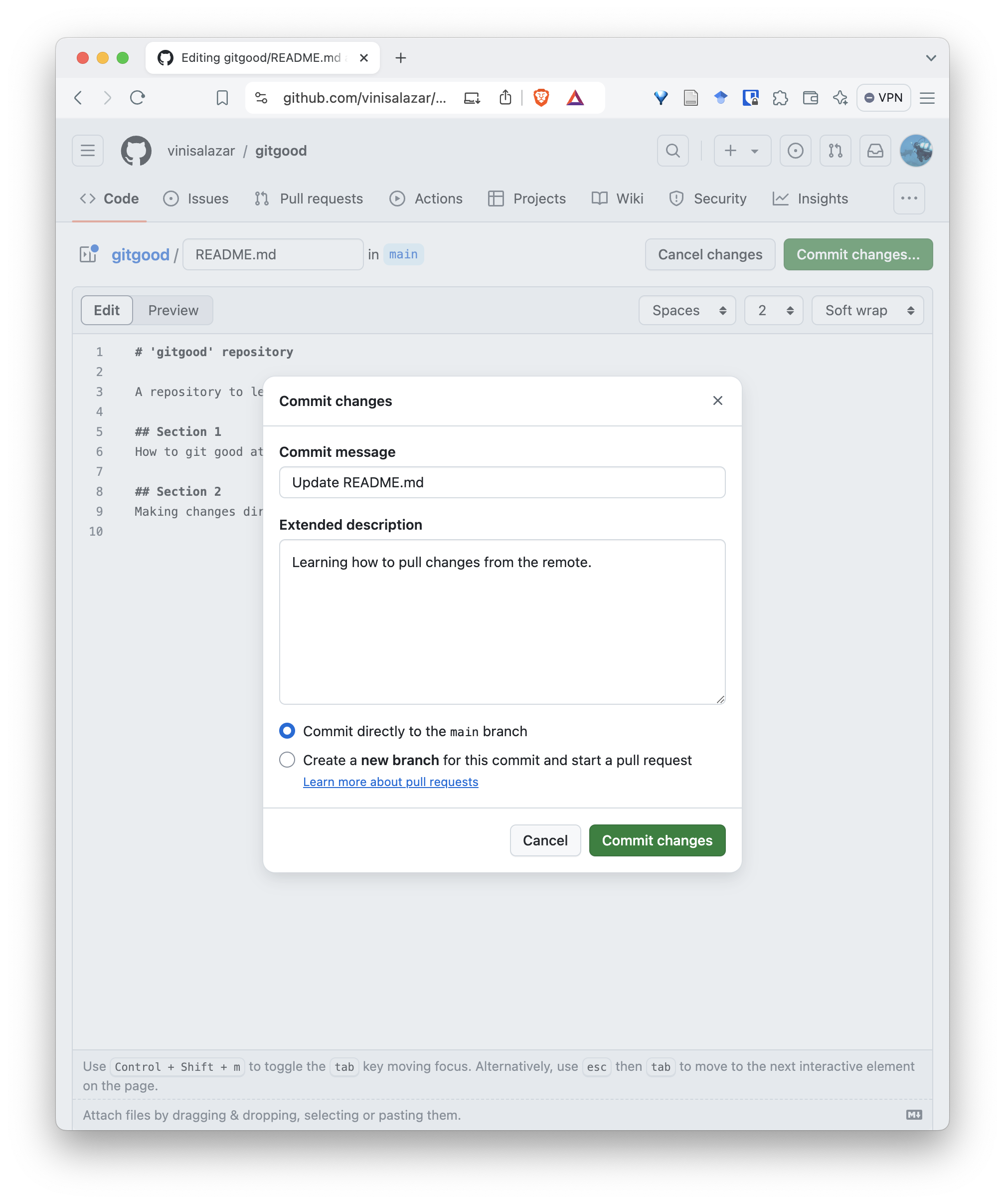 ##) and write something. Click on “Commit changes” on the top right”.