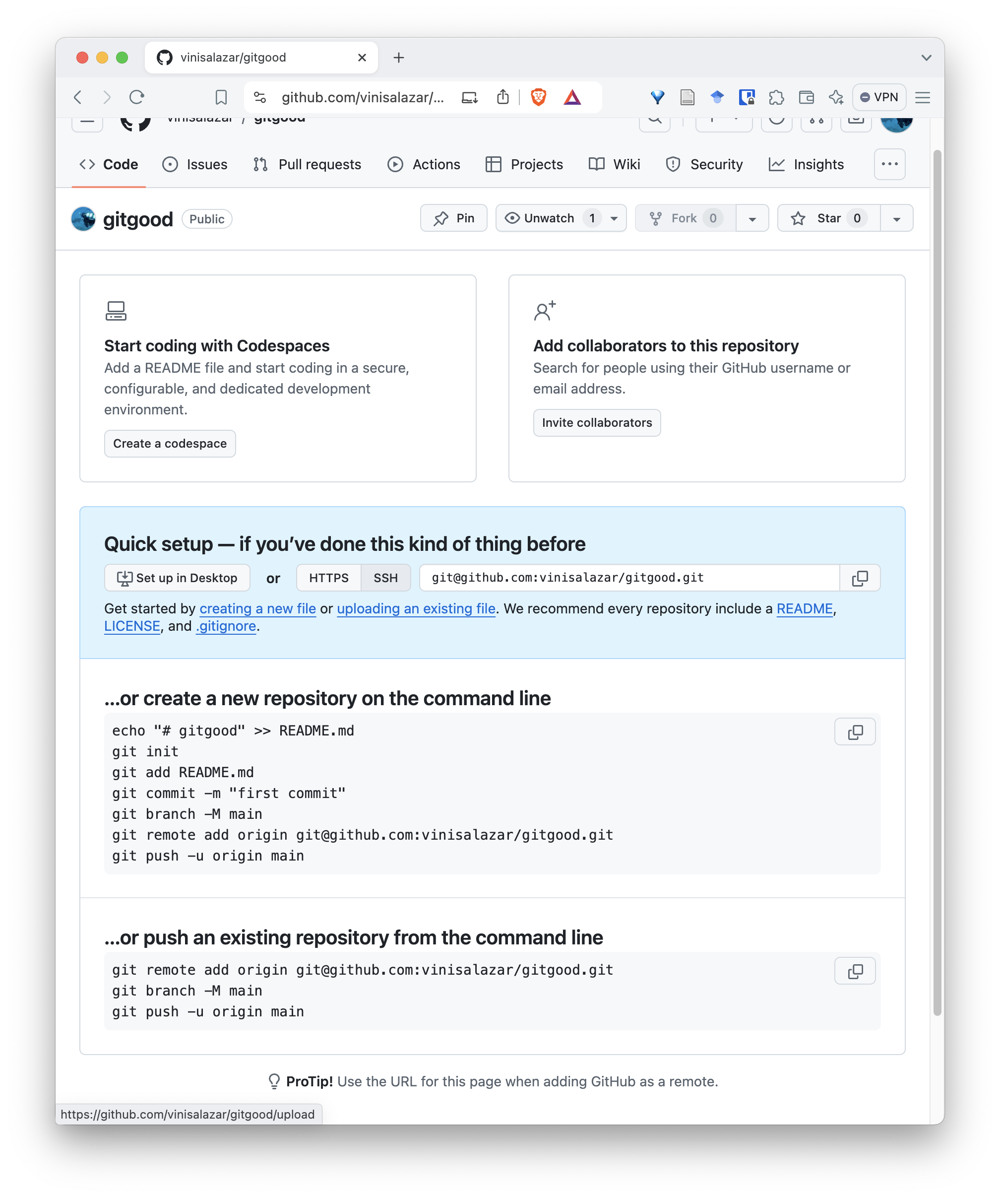 - On the following screen, you will have the commands to set the remote and push the repository from the command line.