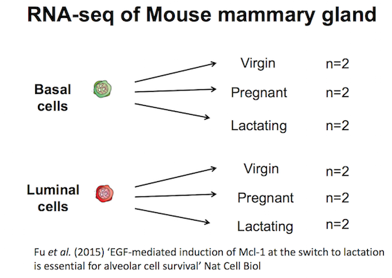 Here we will create some plots using RNA-seq data from the paper by Fu et al. 2015 (GEO accession number GSE60450). Mice, like all mammals, have mammary glands which produce milk to nourish their young. The authors of this study were interested in examining how the mammary epithelium (which line the mammary glands) expands and develops during pregnancy and lactation.