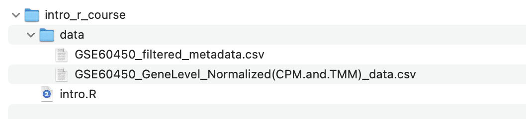 In the next section, you will load these files into R using the file path (i.e. where they are located in the filesystem), so the code in this tutorial expects the files to be in the above location. If you have the files in a different location, you also have the option of changing the commands in the following sections to match where the files are located on your computer.