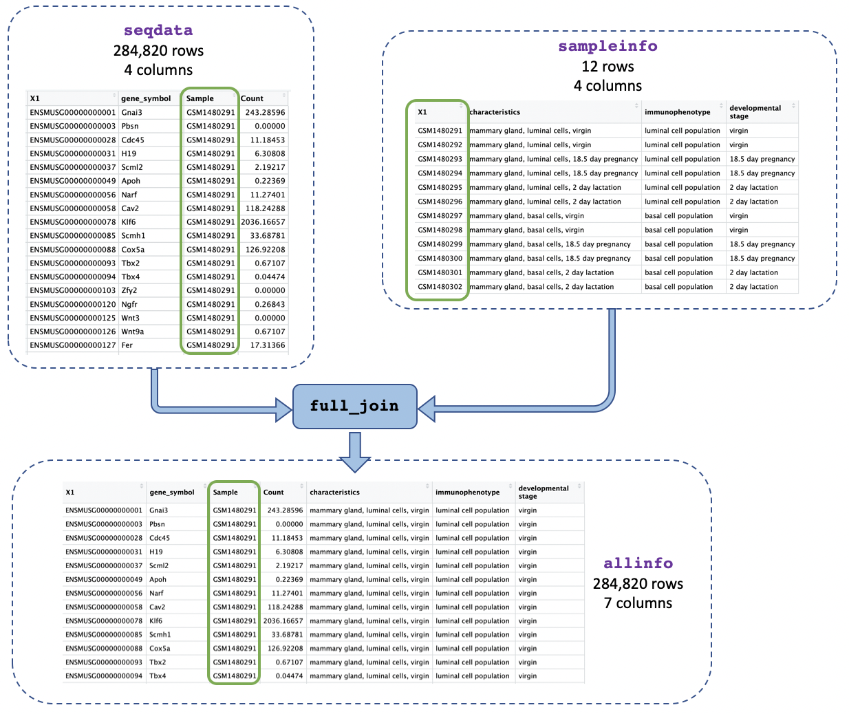 allinfo <- full_join(seqdata, sampleinfo, by = join_by(Sample == sample_id))