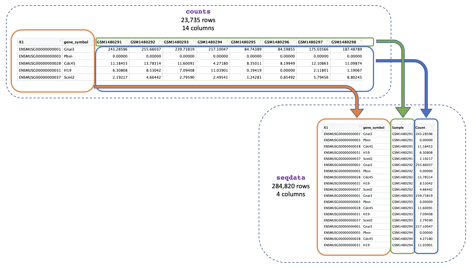 seqdata <- pivot_longer(counts, cols = -c("gene_id", "gene_symbol"),