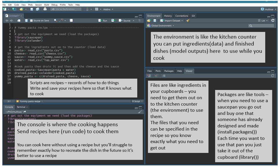 RStudio is an interface that makes it easier to use R. There are four panels in RStudio. The screenshot below shows an analogy linking the different RStudio panels to cooking.