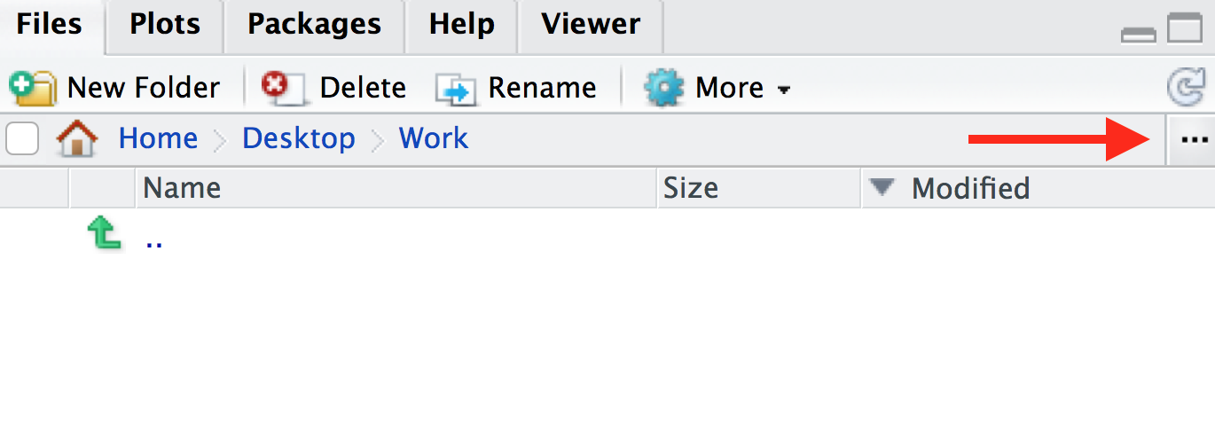 getwd(). This will print out the path to your working directory in the console. It will be in this format:/path/to/working/directory(Mac) orC:\path\to\working\directory(Windows), or - In the bottom-right panel, click the blue cog icon on the menu at