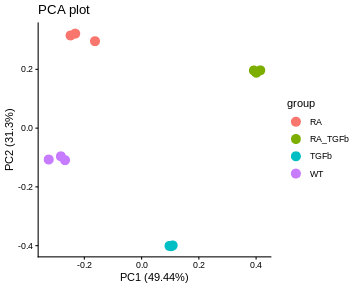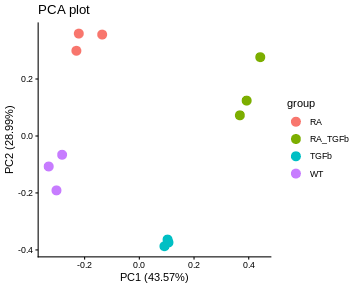 PCA plots. These give a special low dimensional representation of our (very) high dimensional data (i.e. where we’ve taken thousands of measurements on each sample). A ``good” plot looks like this: (1) replicates cluster; and (2) there’s some separation of biological groups.