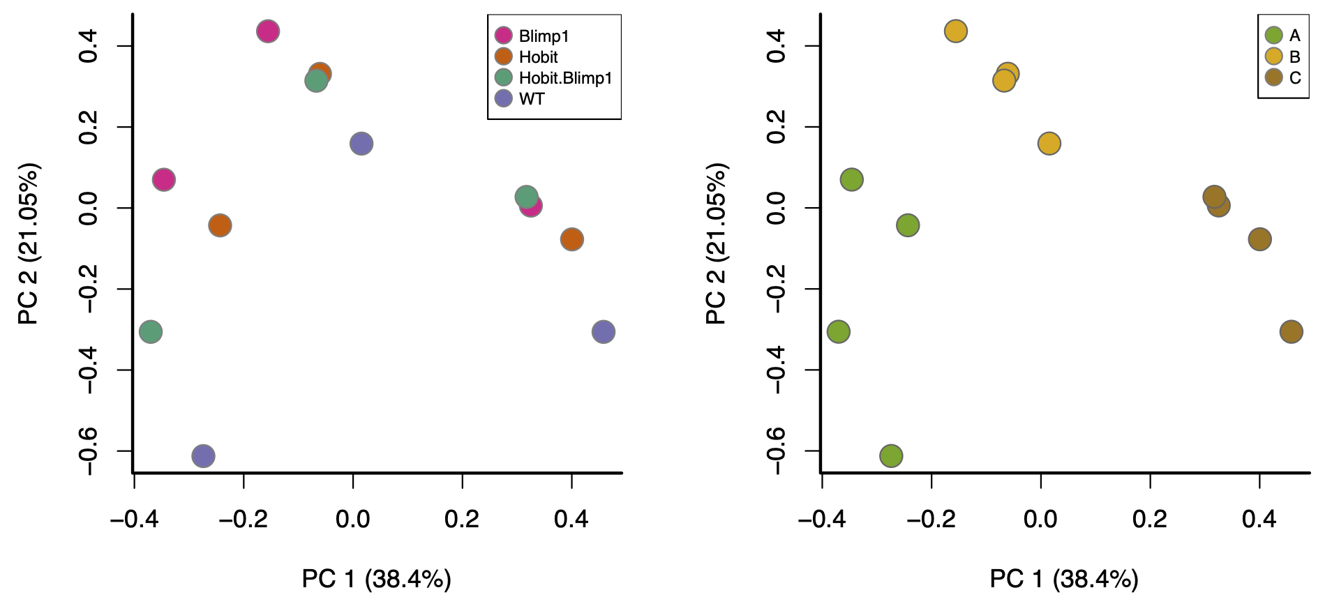These are both the “same” PCA plot, but one is coloured by biological condition and the other is coloured by batch. The major factor driving separation (along PC1) is batch, not biological condition; consequently, replicates are not clustering by group, and the groups aren’t separating. Batch effects like these can only be corrected with more sophisticated analysis approaches, a topic outside the scope of this workshop.
