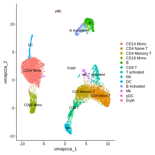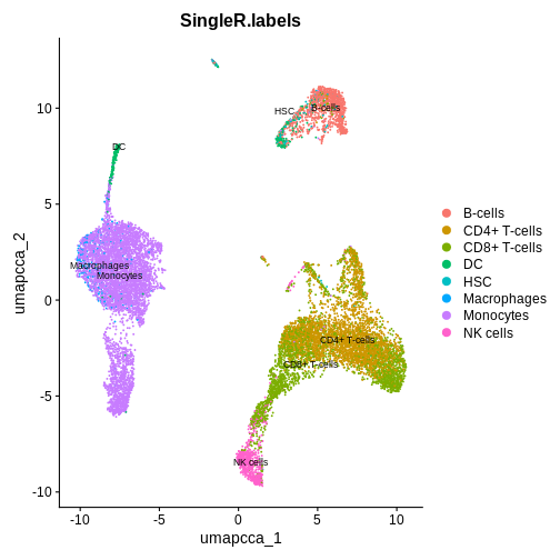 DimPlot(ifnb.filtered, reduction='umap.cca', group.by='SingleR.labels', label = TRUE, label.size = 3 )