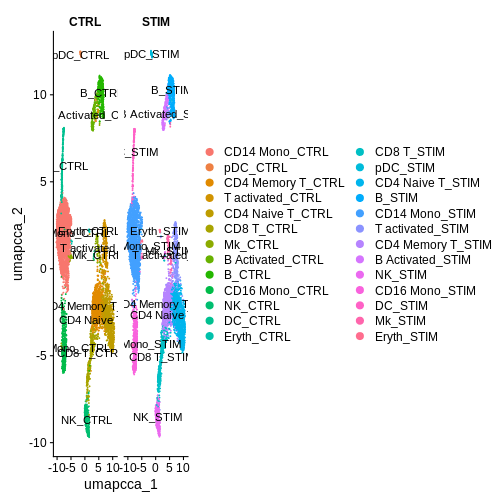 label = T, split.by = "stim") # Lets separate by condition to see what we've done a bit more clearly