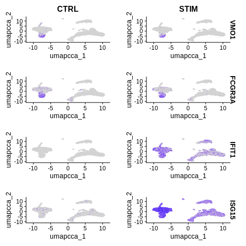 features = c('VMO1', 'FCGR3A', 'IFIT1', 'ISG15'),