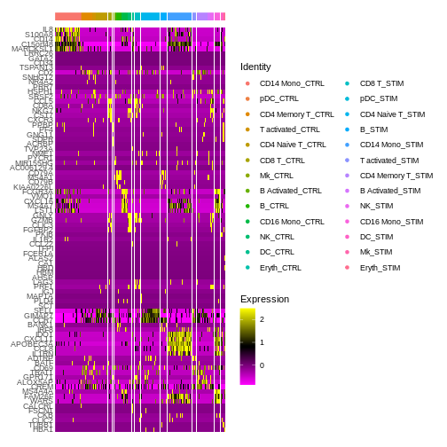 Seurat’s in-built heatmap function can be quite messy and hard to interpret sometimes (we’ll learn how to make better and clearer custom heatmaps using the pheatmap package from our Seurat expression data later on).