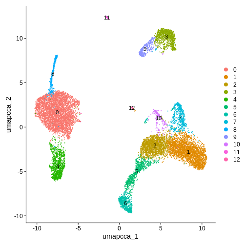 DimPlot(ifnb.filtered, reduction = "umap.cca", label = T) # each cluster is now made up of two labels (control or stimulated)