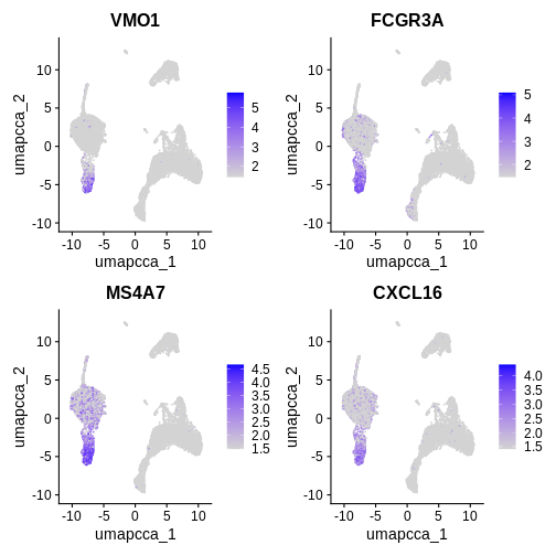 features = c('VMO1', 'FCGR3A', 'MS4A7', 'CXCL16'), min.cutoff = 'q10')